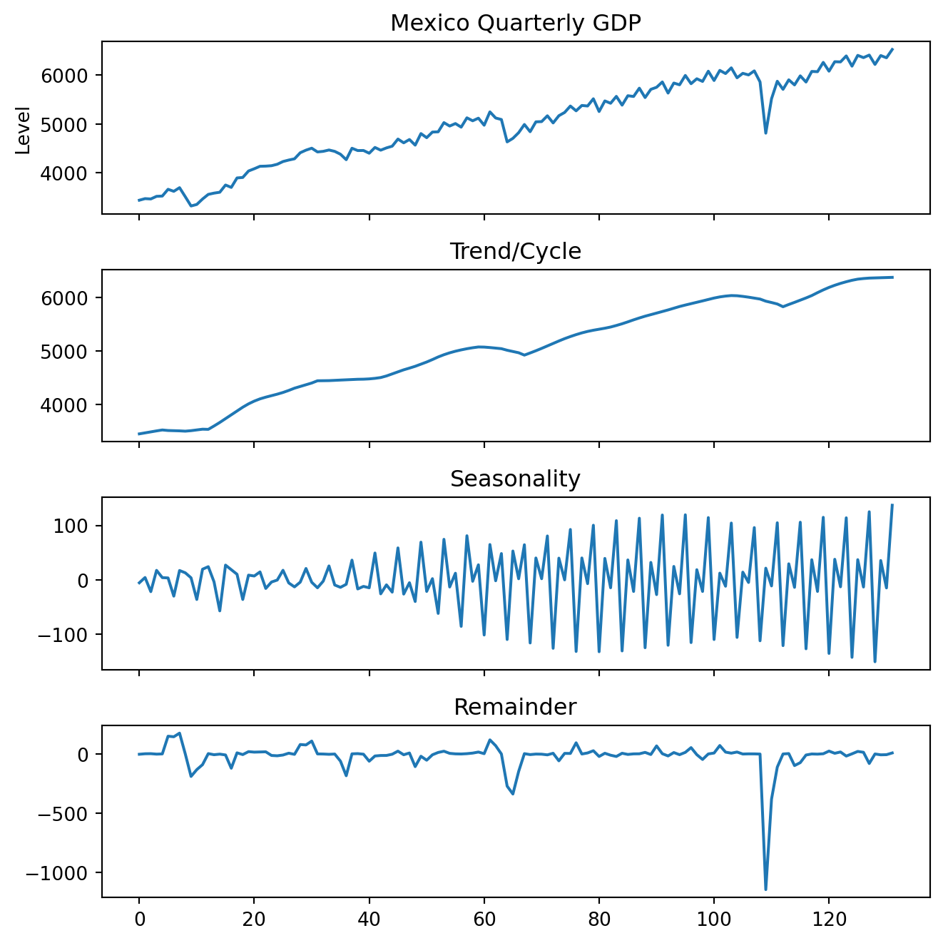 Explore the basic concepts of time series analysis using Mexico’s quarterly GDP data. Begin by visualizing the series and decomposing it into its fundamental components: trend/cycle, seasonality, and remainder. This illustrates the additive structure commonly used in economic and financial data.