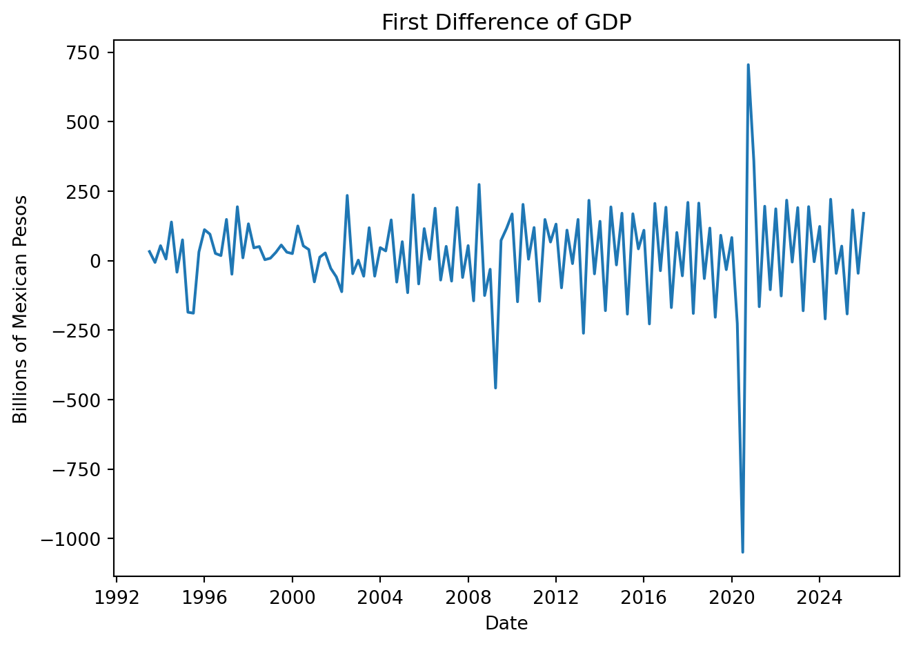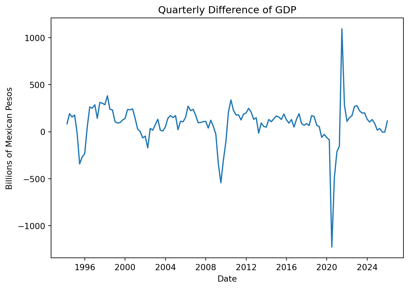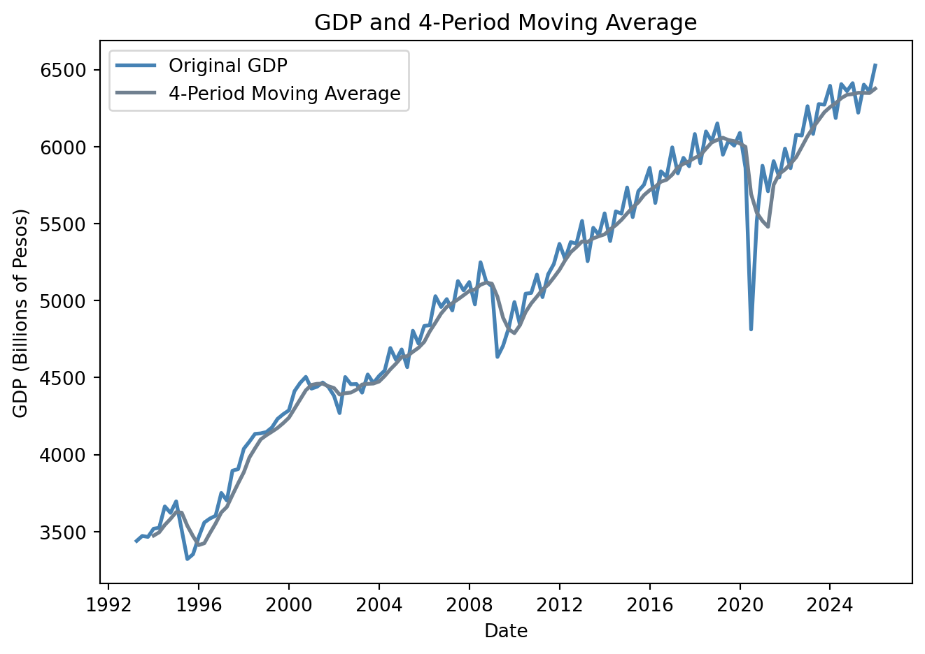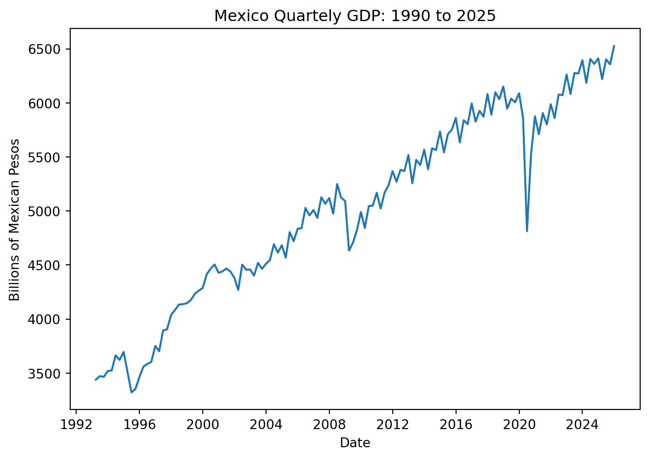 GDP = pdr.DataReader('NGDPRNSAXDCMXQ', 'fred', start='1993Q1', end = '2025Q4')