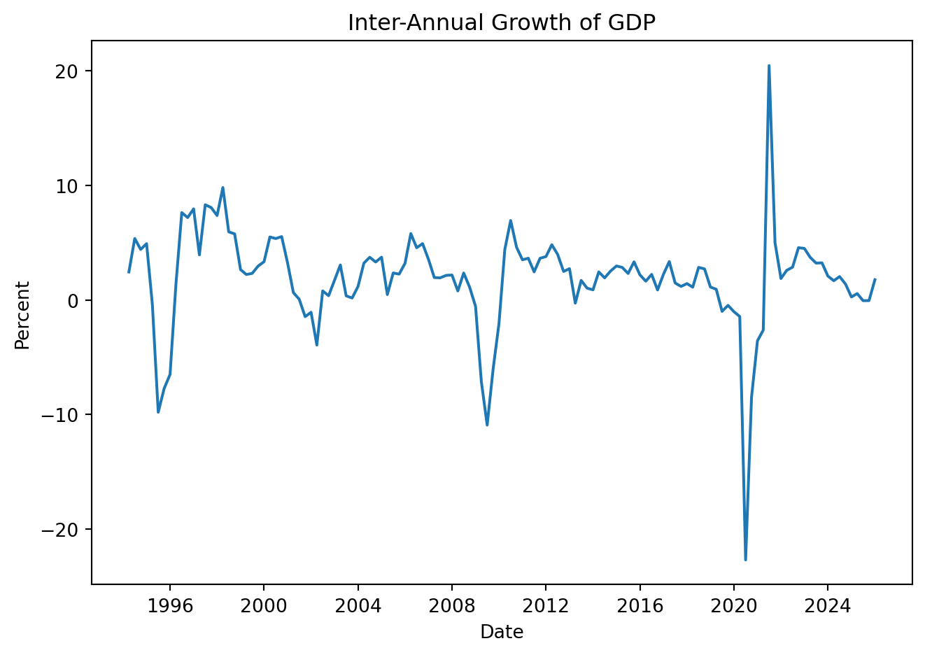 The first difference of a series, \(\Delta Y_t\), is its change between periods \(t\) and \(t-1\):