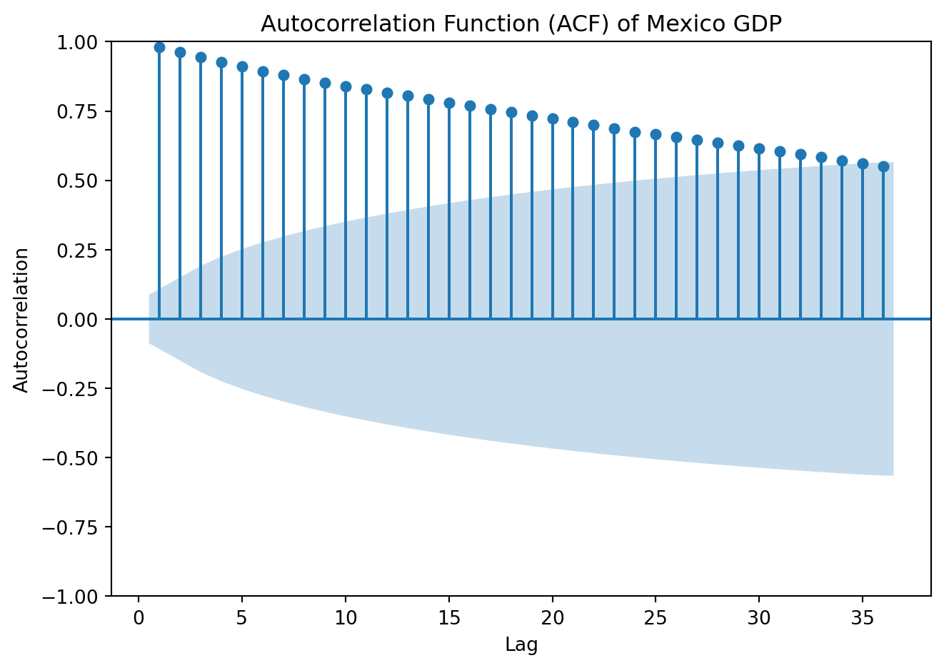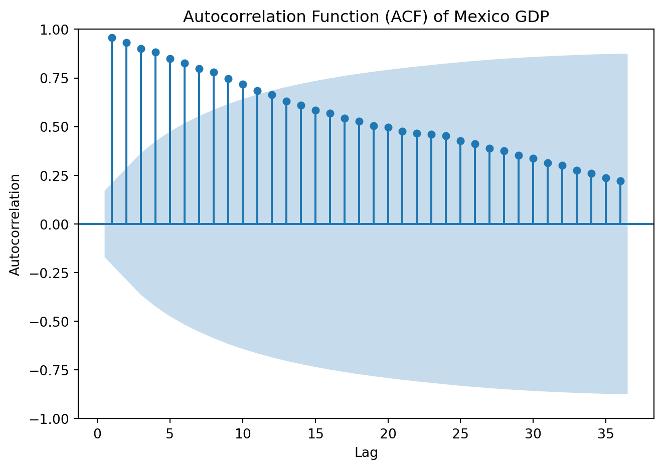 plot_acf(data['y'], lags=36, zero=False)