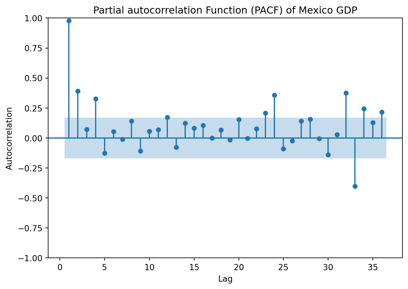 plot_acf(data['y1'], lags=36, zero=False)