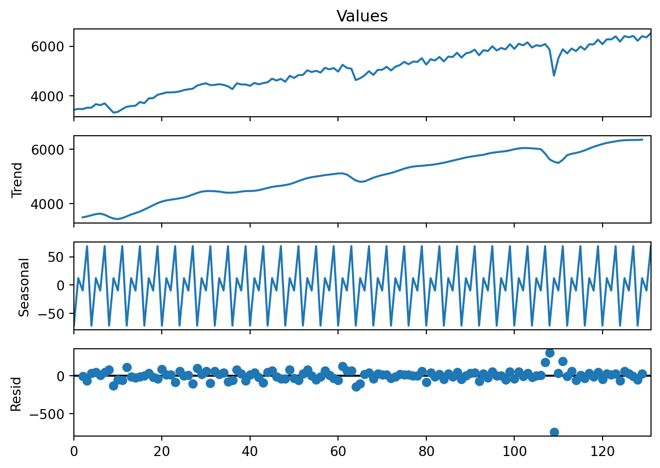 decomp = sm.tsa.seasonal_decompose(GDP['Values'], model='additive', period=4)