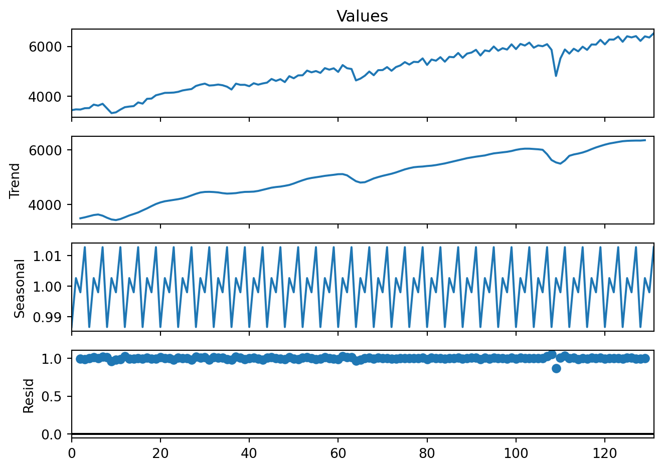 decomp2 = sm.tsa.seasonal_decompose(GDP['Values'], model='multiplicative', period=4)