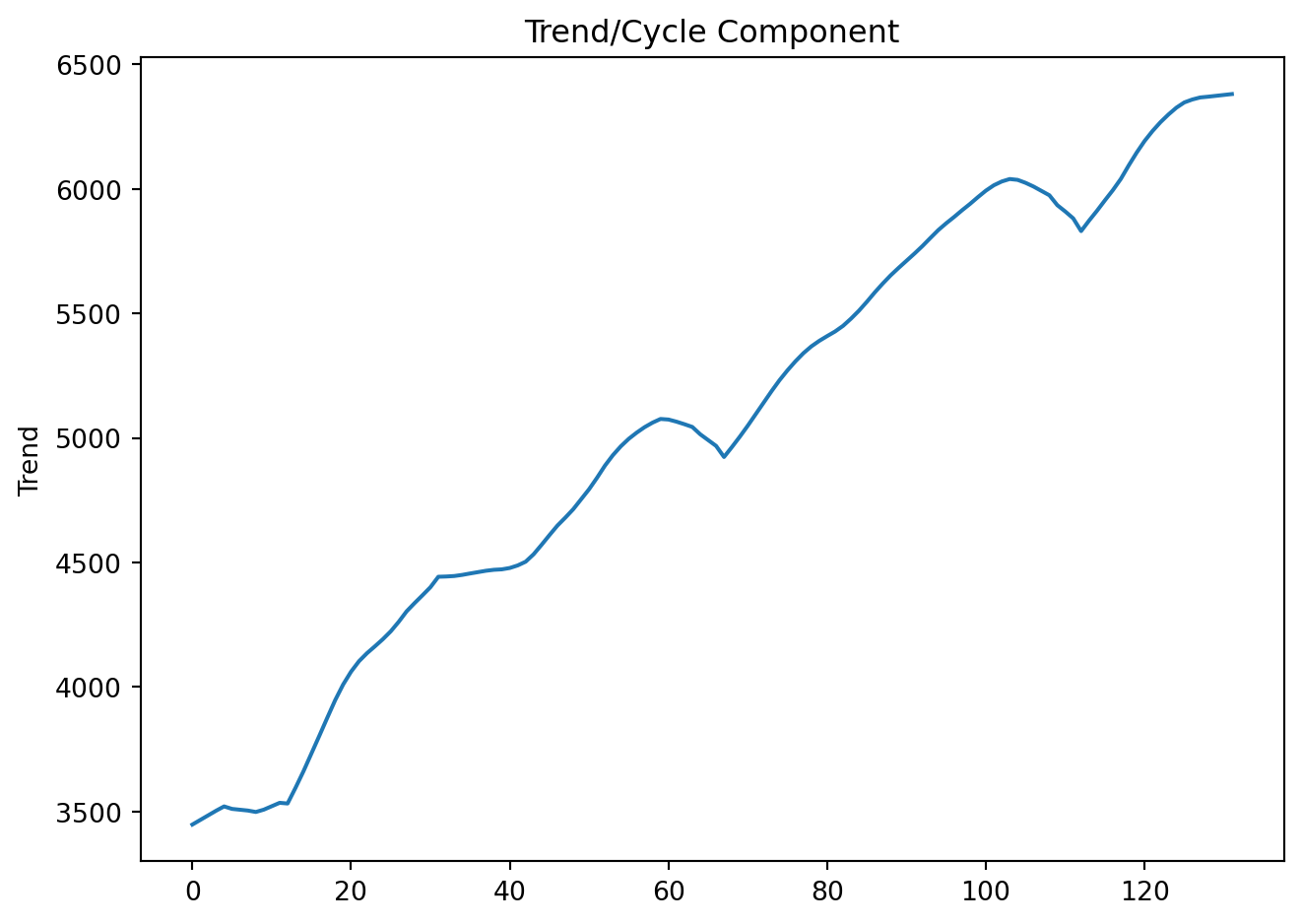 Trend \((T_t)\) captures the long run direction of the series, persistent upward or downward movements. It reflects structural forces rather than short-term fluctuations.